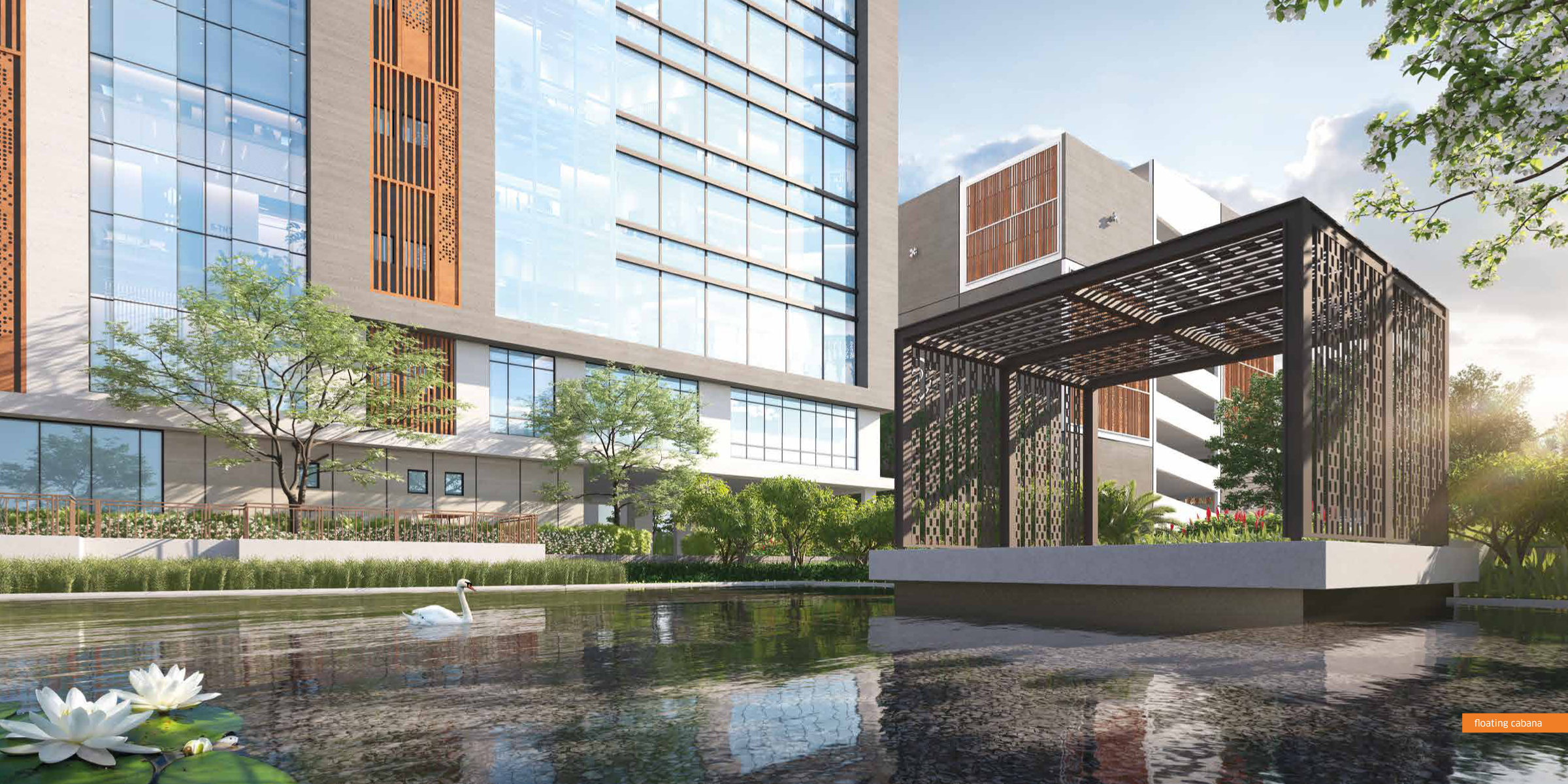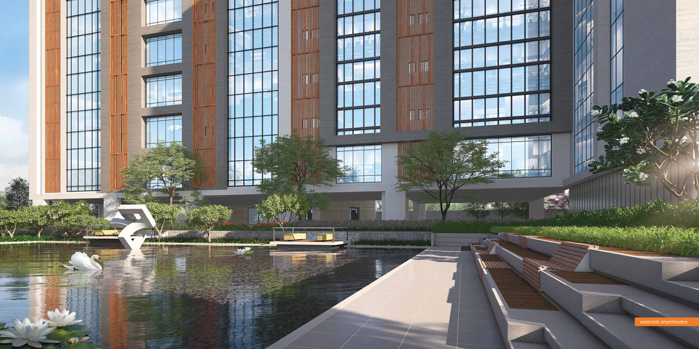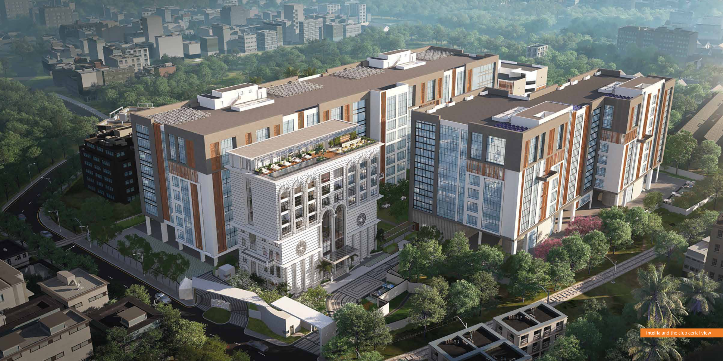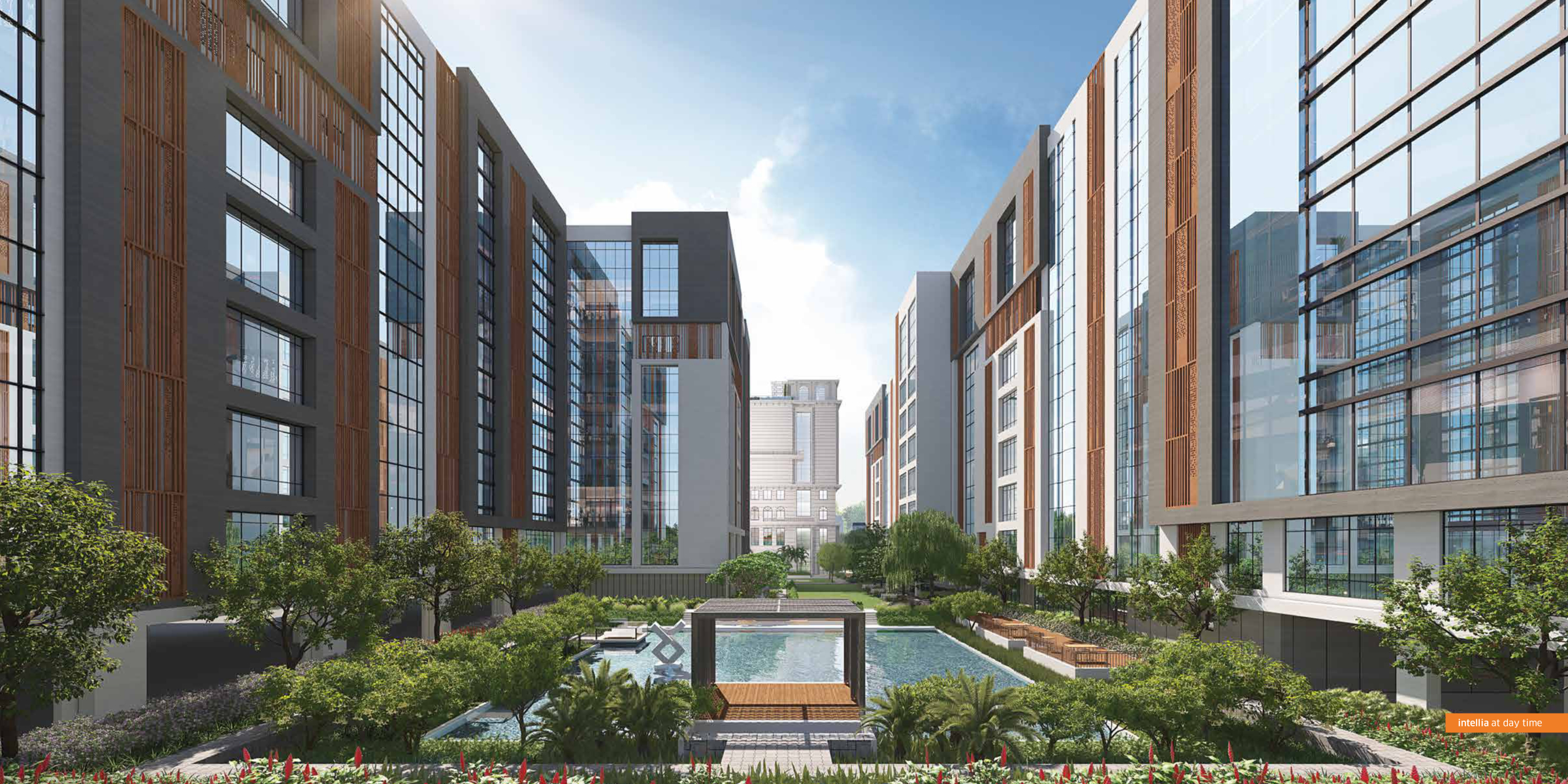 Intellia blends workspaces with lifestyle amenities — landscaped greens, natural waterbody, waterfront café, walking paths, and open-air meeting zones to recharge and network. intellia.srijanrealty.com+1